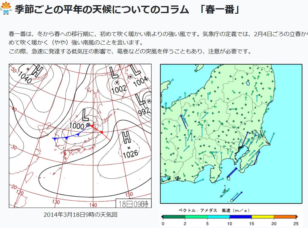 During this period, the winter pressure pattern begins to collapse. Cold northern air and warm southern air switch their positions, and a low-pressure system passes over the Japanese archipelago. As a result, a strong and warm southerly wind blows. This wind is called Haru-Ichiban.