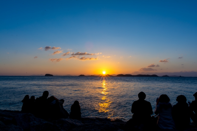 Praying to the sun — an ancient form of animism — still lives deeply in the Japanese heart. One symbolic custom is Hatsu-Hinode, watching and praying to the first sunrise of the year on January 1st. Before dawn, many people gather along the eastern seashores or on hilltops to see the first sunrise. When the sun finally appears above the horizon, they join their hands and pray for a happy new year.