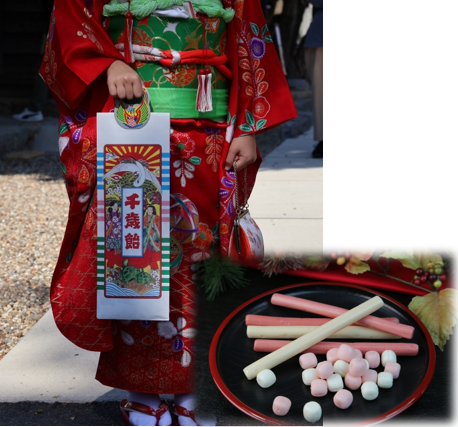 Children receive a talisman and also Chitose-Ame 千歳飴, long-shaped candy specially made for Shichi-Go-San, which symbolizes healthy growth and long life.